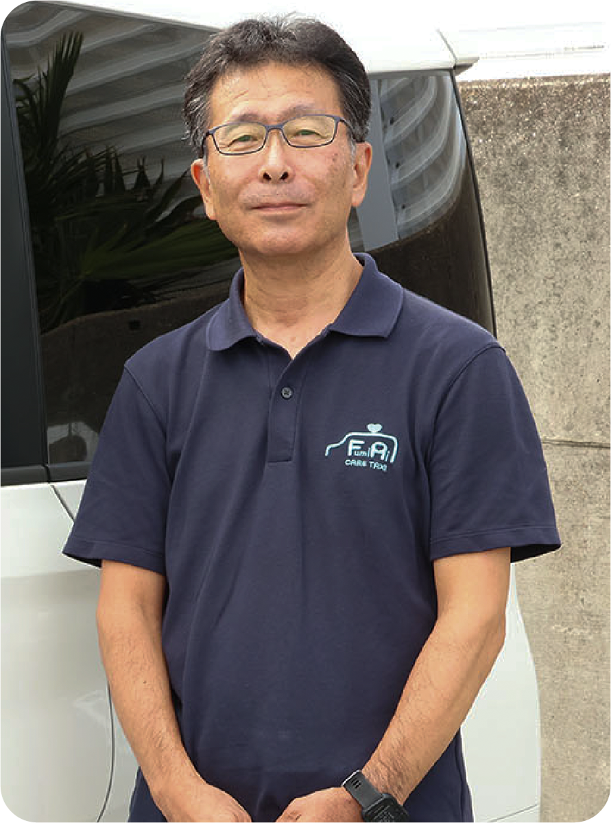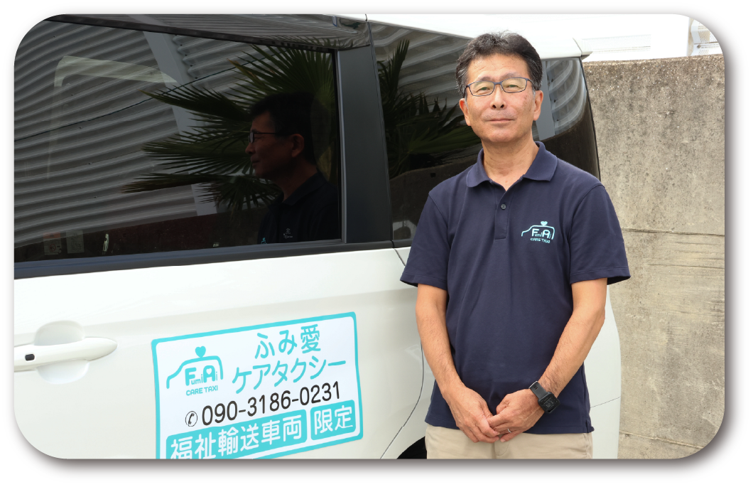 はじめまして。介護タクシーふみ愛ケアタクシーの武村です。当社ホームページをご覧いただき厚く御礼申し上げます。